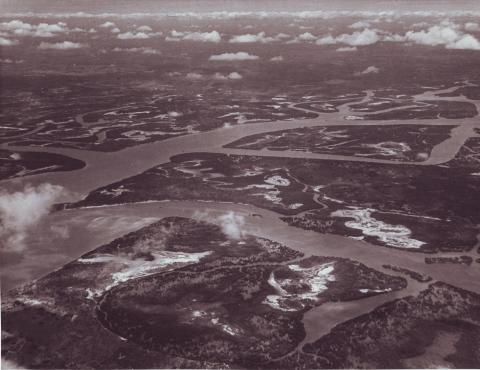 The dense forest with Amazon river winding its route from the Andes mountain range in Peru to its estuary north of Belem. Photo https://notevenpast.org/seth-garfield-brazilian-amazon/